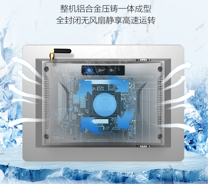 基于心電儀長時間運行的工作轉態,在散熱方面工業安卓一體機完全沒有壓力。整機一體壓鑄成型,全封閉無風扇設計(可定制有風扇),后蓋圓弧散熱孔設計,杜絕粉塵、水滴進入機器內部的同時,也保障了機器的散熱性。同時,無風扇設計運行更靜音,無需擔心機器運行產生噪音而打擾病房安靜。